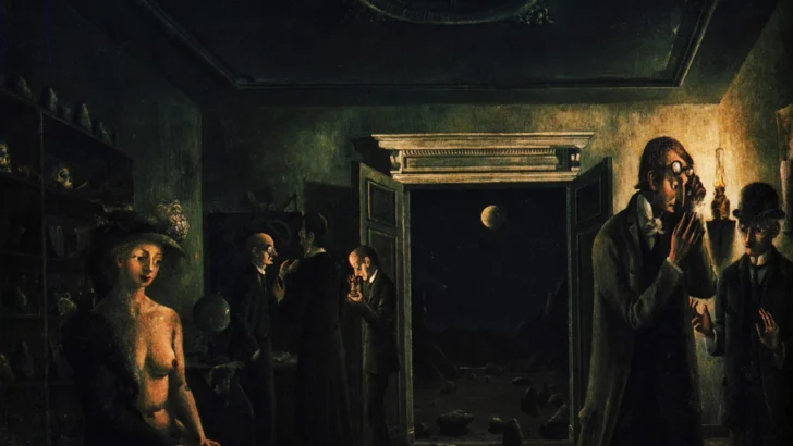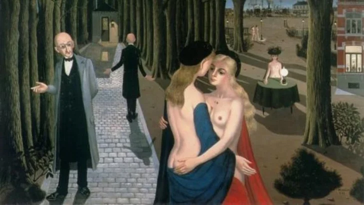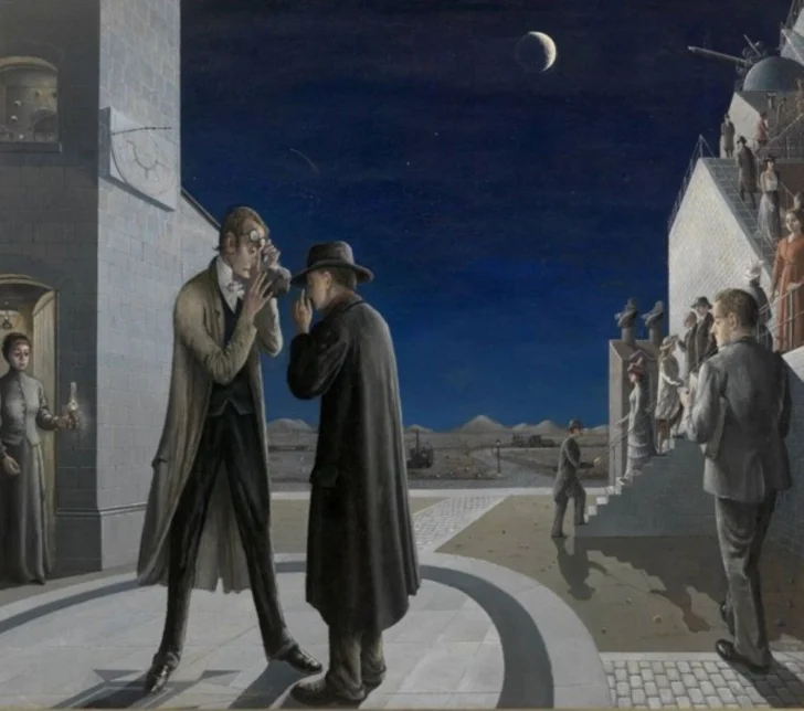 En Siestas, y evocando las láminas ya mencionadas, la voz en primera persona dice lo siguiente: “(…) todo pasaba en lugares donde había luna llena y las mujeres andaban desnudas por las calles y las estaciones, cruzándose como si no se vieran y estuvieran terriblemente solas, y a veces los señores de traje negro o guardapolvo gris que las miraban ir y venir o estudiaban piedras raras con un microscopio y sin sacarse el sombrero”. Nunca sabremos a ciencia cierta a cuál de las obras de Delvaux referenciaba Cortázar específicamente en este pasaje, sin embargo, parecería que se trata de una reconstrucción nacida desde varias de sus telas, incluyendo Las fases de la luna II, Las fases de la luna III y Tributo a Julio Verne. Óleos que, una vez más, incorporarán alegorías al admirado Verne y las comentadas siluetas que le obsesionaron frecuentemente expuestas como objetos sexualizados.