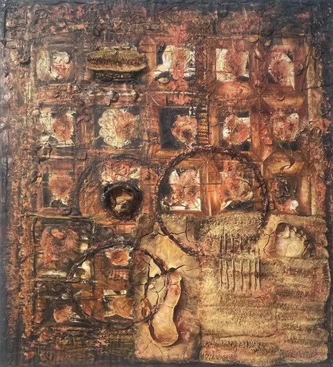 Aunque la mayoría son abstractas, también hay obras con figuraciones realistas, expresionistas. Es el caso de “Un corazón tendido al sol”, cuyo centro lo ocupa un relieve de cajas contiguas, una de las cuales contiene un corazón escultórico. En “El patio del tiempo” destacan gavetas seriadas llenas de todo lo inimaginable. Una huella sobre el lodo refleja la humanidad. “Timbí de emociones”, perfilada por tiras incrustadas sobre una tela, presenta una naturaleza similar.
